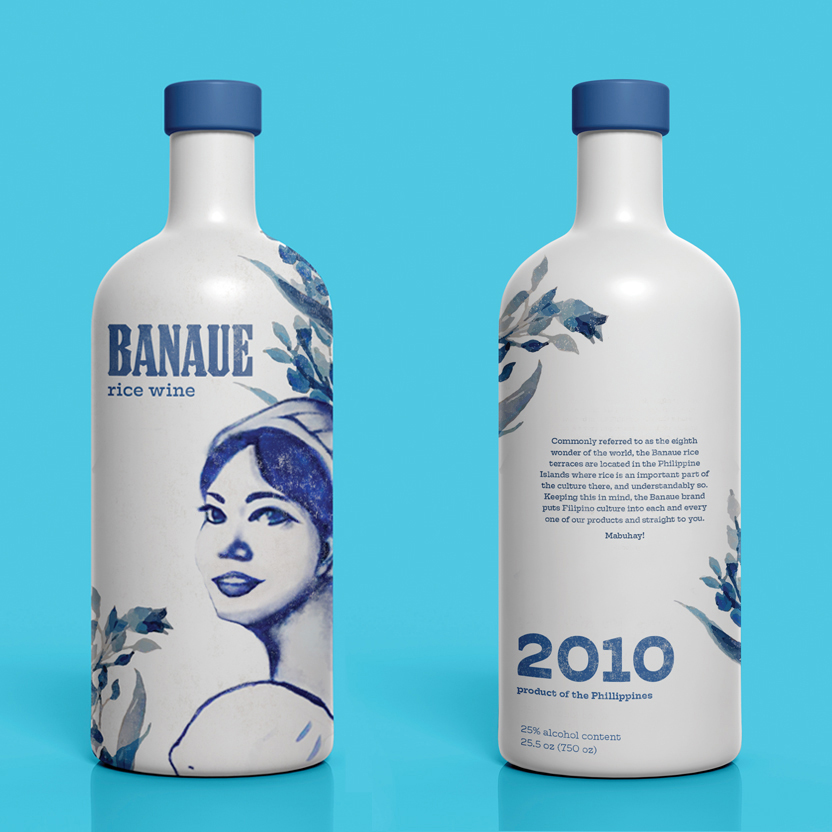 The aesthetic of Banaue is inspired by delftware pottery, another staple popular in the Philippines, to encourage the buyer to continue to use the bottle as decoration.